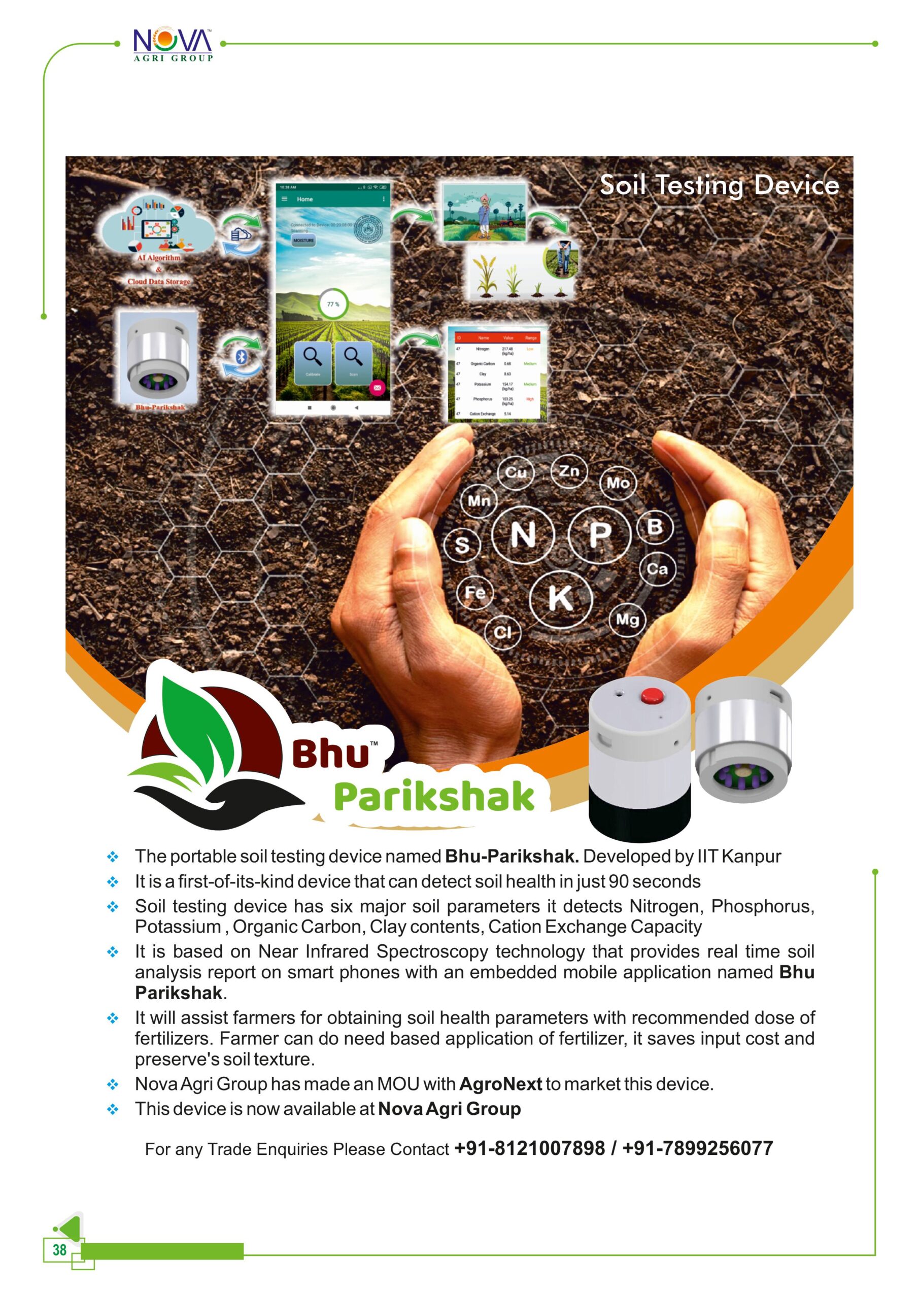 - It is based on Near Infrared Spectroscopy technology that provides real time soil analysis report on smart phones with an embedded mobile application named Bhu Parikshak.